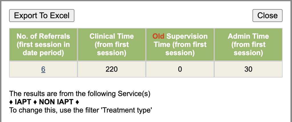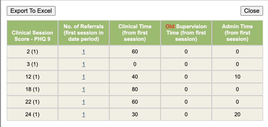 This report will show the number of referrals against each PHQ9 score so you can identify the patients below caseness etc. This report can be used for GAD7 etc.