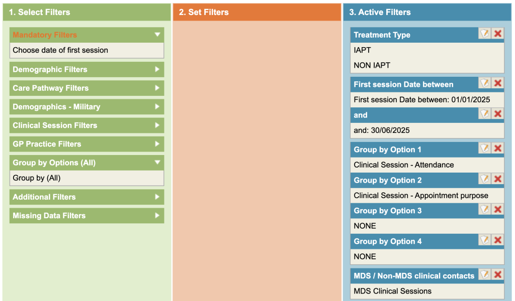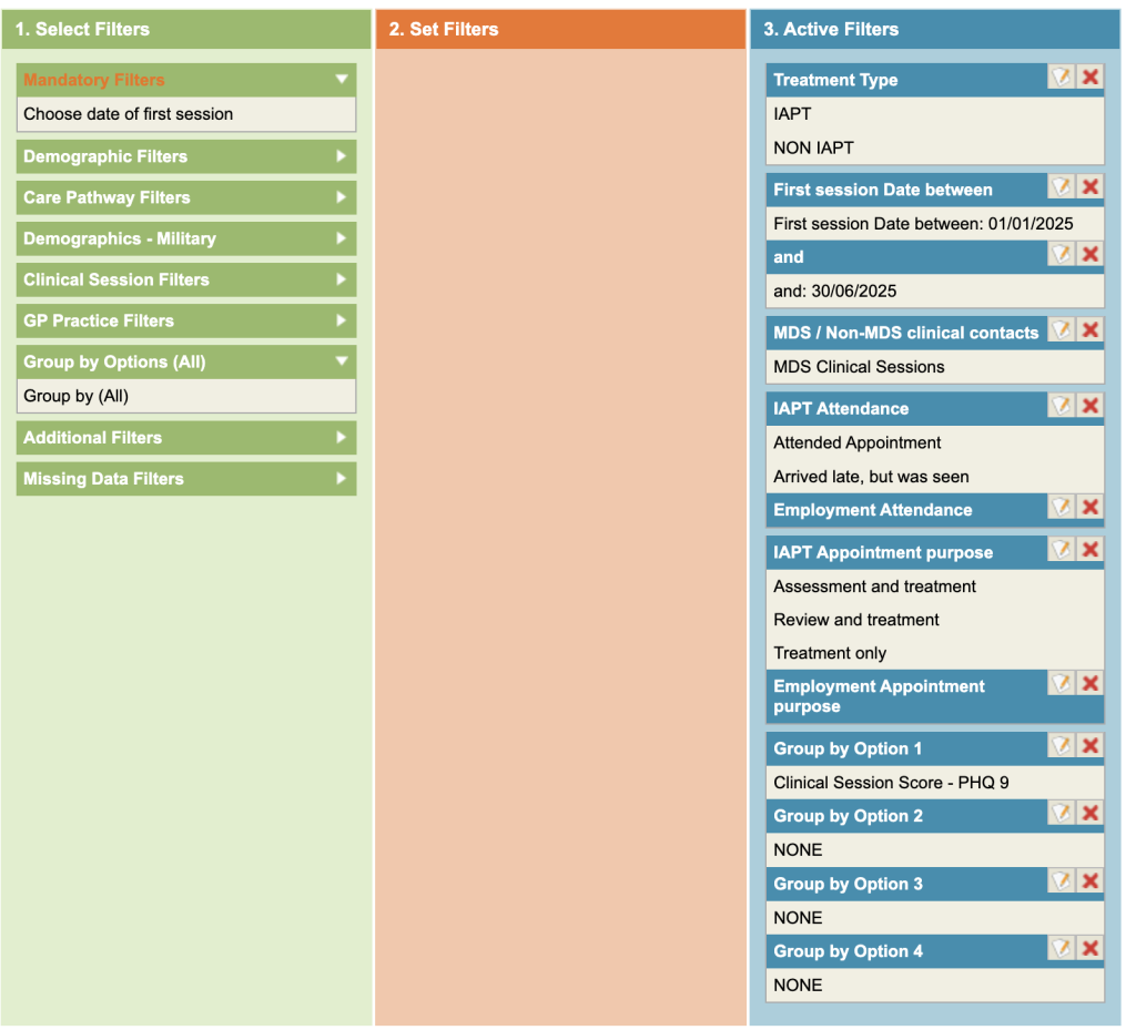 The example below, shows filters querying first session being between 1/1/25 and 30/6/25 for sessions that were Attended Appointment and Arrived late, but was seen.