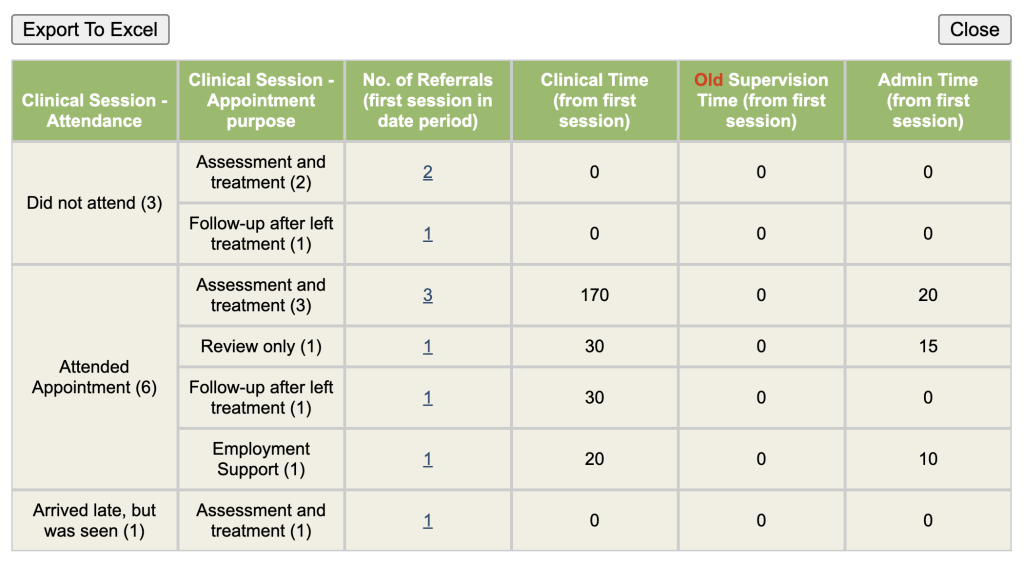 - Group by Clinical session – Attendance and Appointment Purpose.