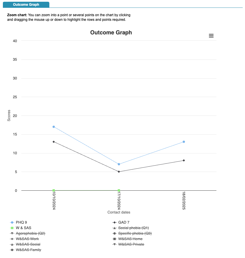 You can switch on different questionnaires by clicking on or off of the headings. You can view multiple scores on the graph or you can toggle all questionnaire scores on and off. You also have the option to ‘Toggle Interpolation’, which means it will make guesses about the graph in between the data points.
