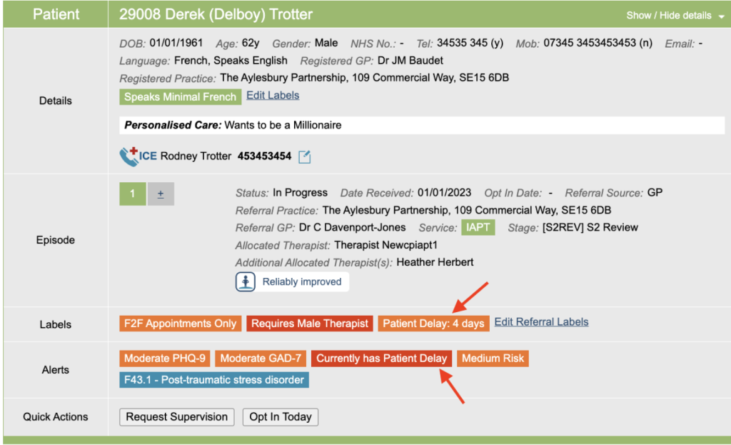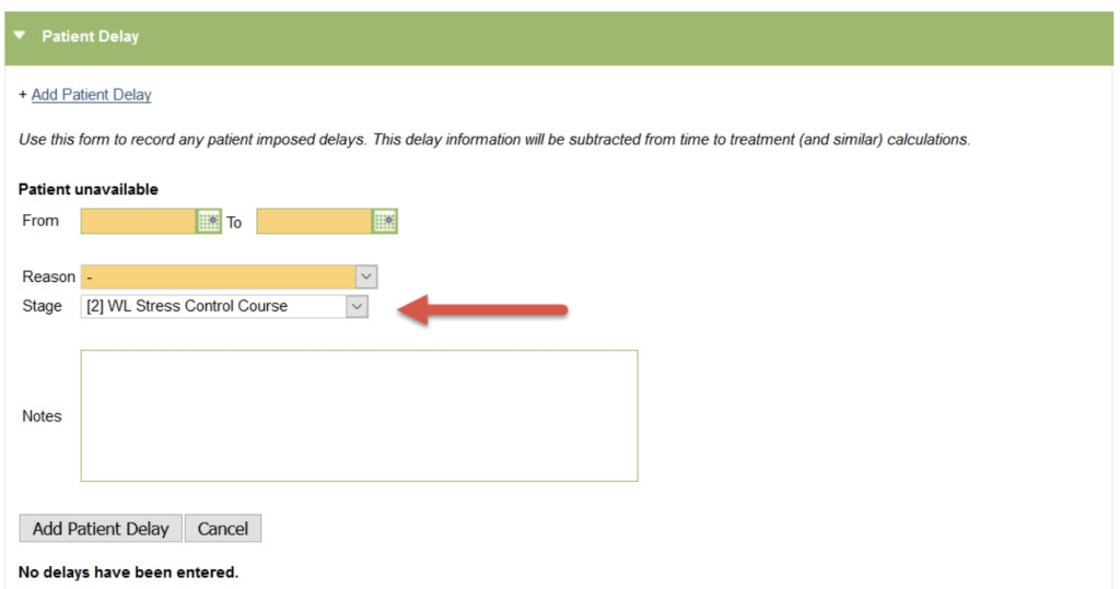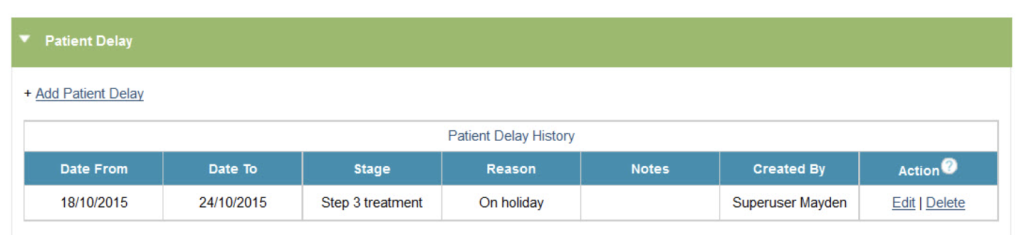 Once complete, a table will appear showing all the patient delays that have been recorded for this referral.