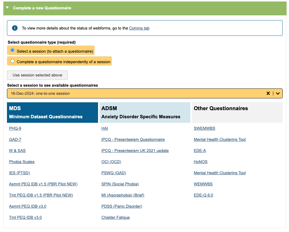 Questionnaires or outcome measures completed via the Clinical Contacts tab must be linked with a clinical contact, which you can select in the ‘Select a session to see available questionnaires’ field.