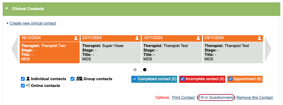 You can also navigate to the questionnaire selection for a clinical contact using the ‘Fill in Questionnaire’ hyperlink.