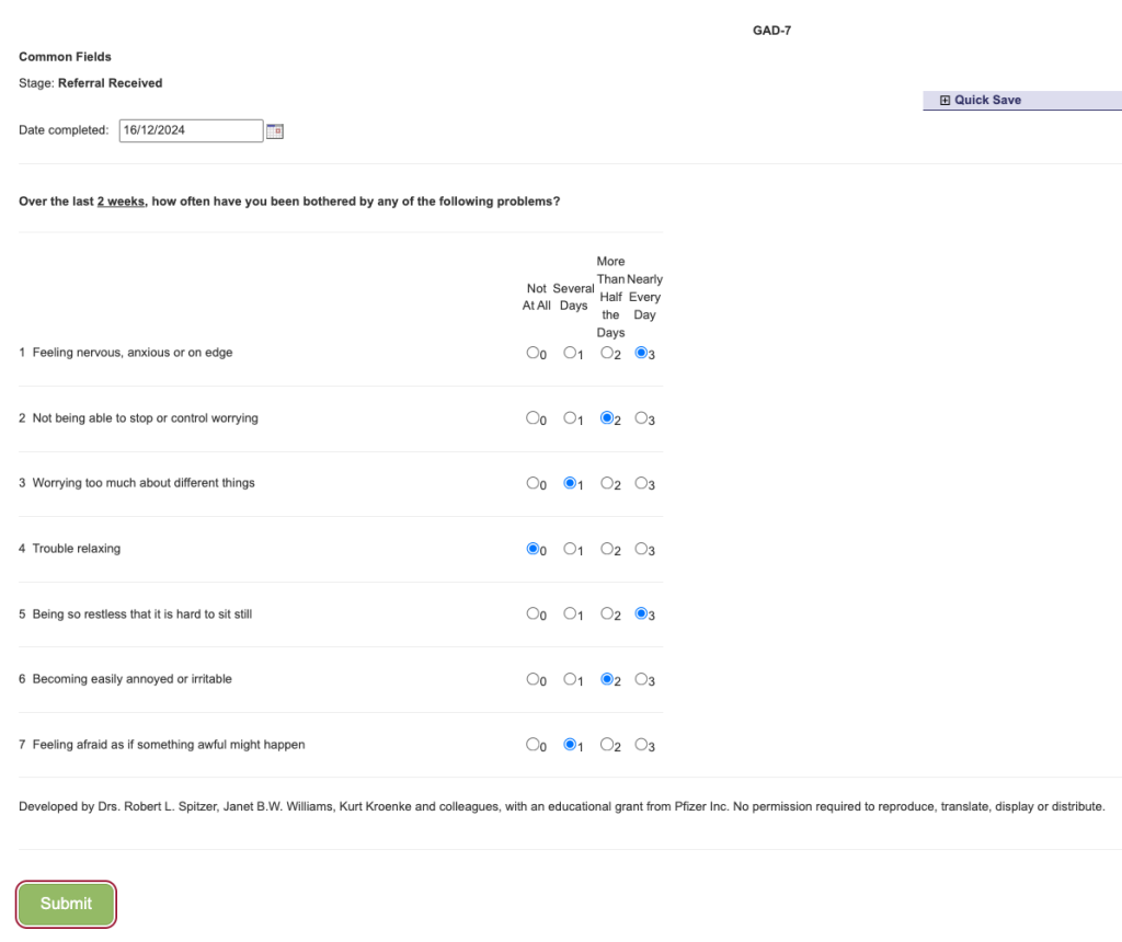Once you have selected the questionnaire, complete all the fields and click ‘Submit’ when you are ready to save this.