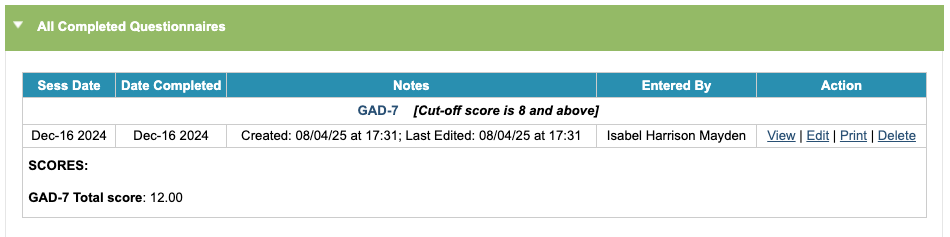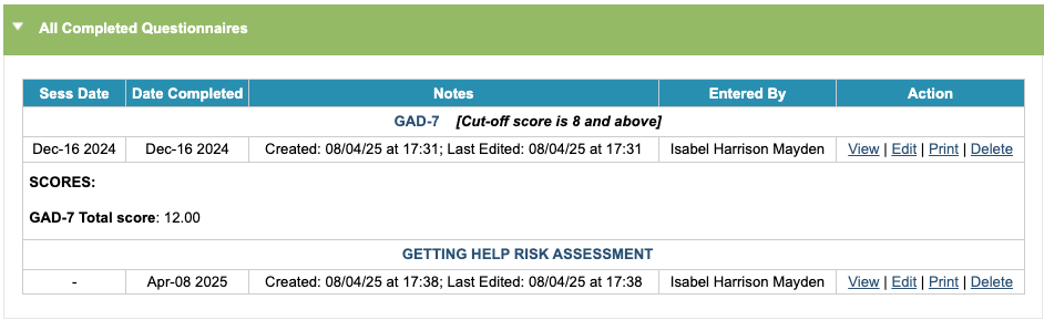 A history of questionnaires completed via the Assessment tab will show below any hyperlinked questionnaires. Within the table, you can view the questionnaire, edit or delete this.