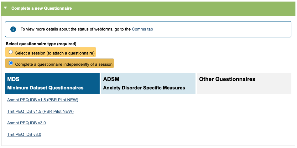 For Adult Talking Therapies services, you can complete a Patient Experience Questionnaire without attaching this to a session, as these are often sent after the treatment has ended. To do this, click on the radio button option ‘Complete a questionnaire independently of a session’ and choose the appropriate PEQ.