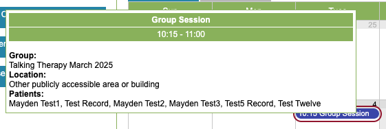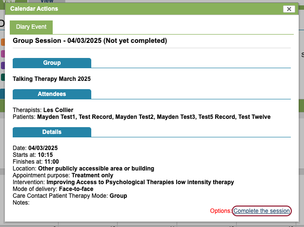 You can go to the lead therapist’s diary and hover over the group event to see a brief summary of the group session. Clicking on the event will give you more details, and you can even complete that group session for all attendees.