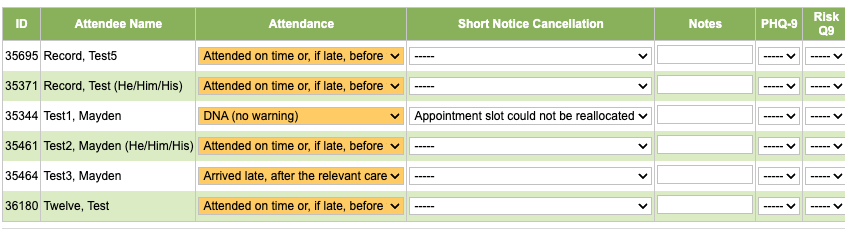 Each patient will have a row in the table which you will then need to complete the fields for. The ‘Notes’ field in the table is for specific patient notes about that particular session. You will need to scroll to the end to make sure all fields are completed.