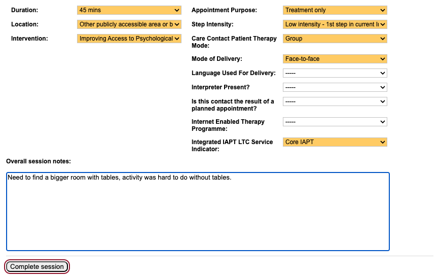When you have entered all the information for the group session, click ‘Complete session’.