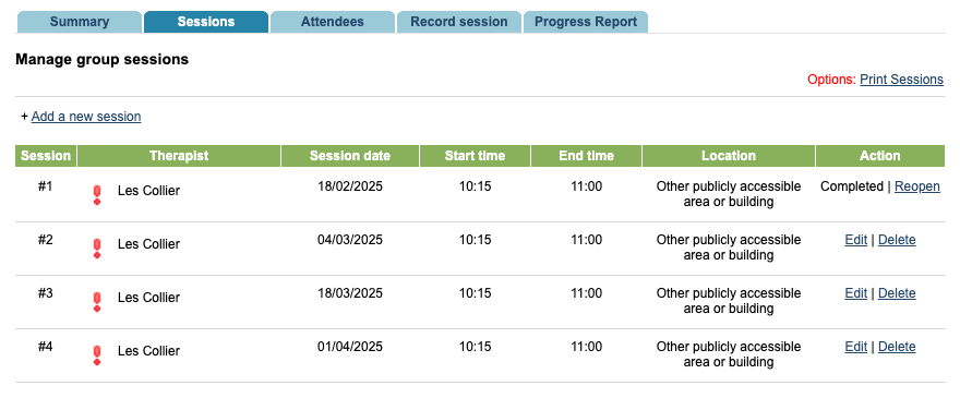 Once you have completed the session, the session will show as completed in the ‘Sessions’ tab. If you need to amend the information recorded against the session, click ‘Reopen’. You cannot delete a session when it is completed.