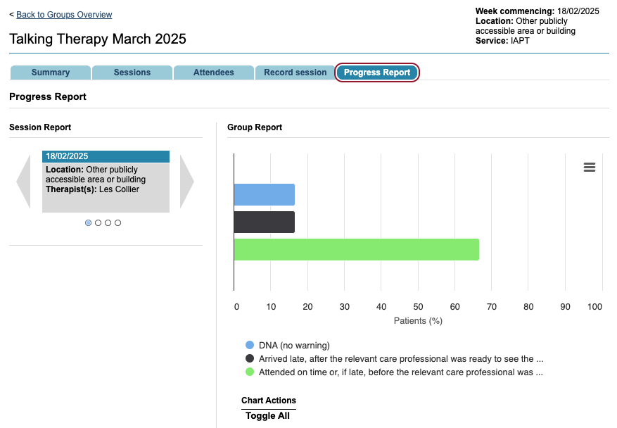 As well as recording the group session information, you can also view the Progress Report. To do this, find your group in Groups Overview then click to the Progress Report tab.