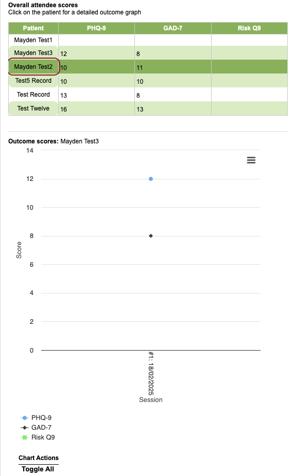 You can click on the patient to view a detailed outcome graph for their scores only.