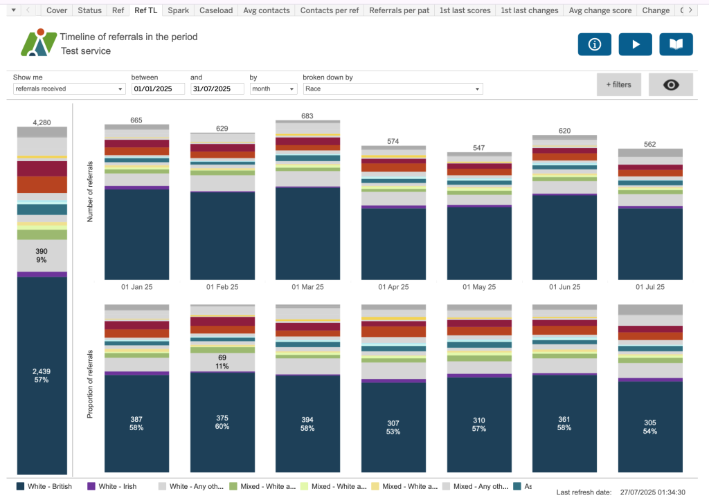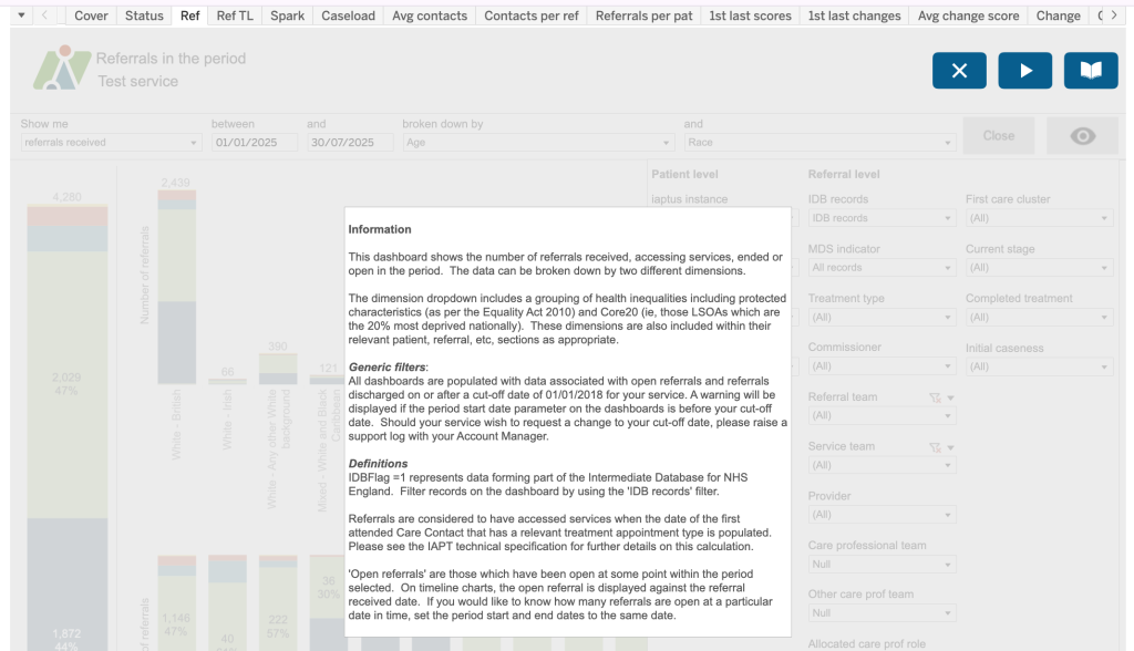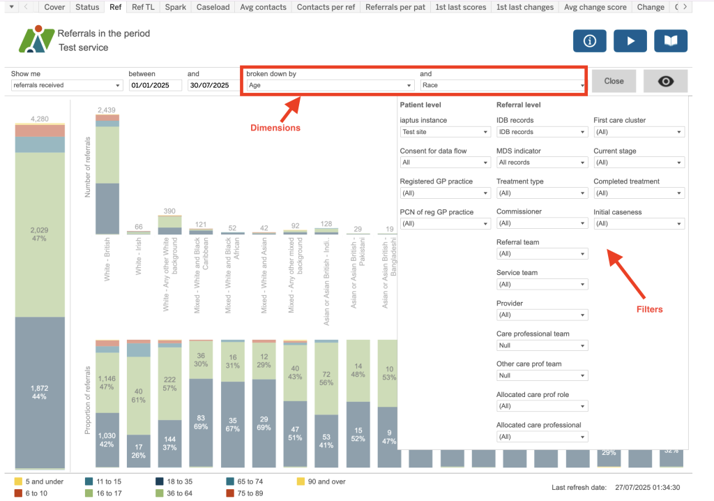 The dimensions dropdown includes a grouping of health inequalities including protected charactieristics (as per the Equality Act 2010) and Core20 (ie, those LSOAs which are the 20% most deprived nationally). Theser dimensions are also included within their relevant patient, referral, etc, section as appropriate.