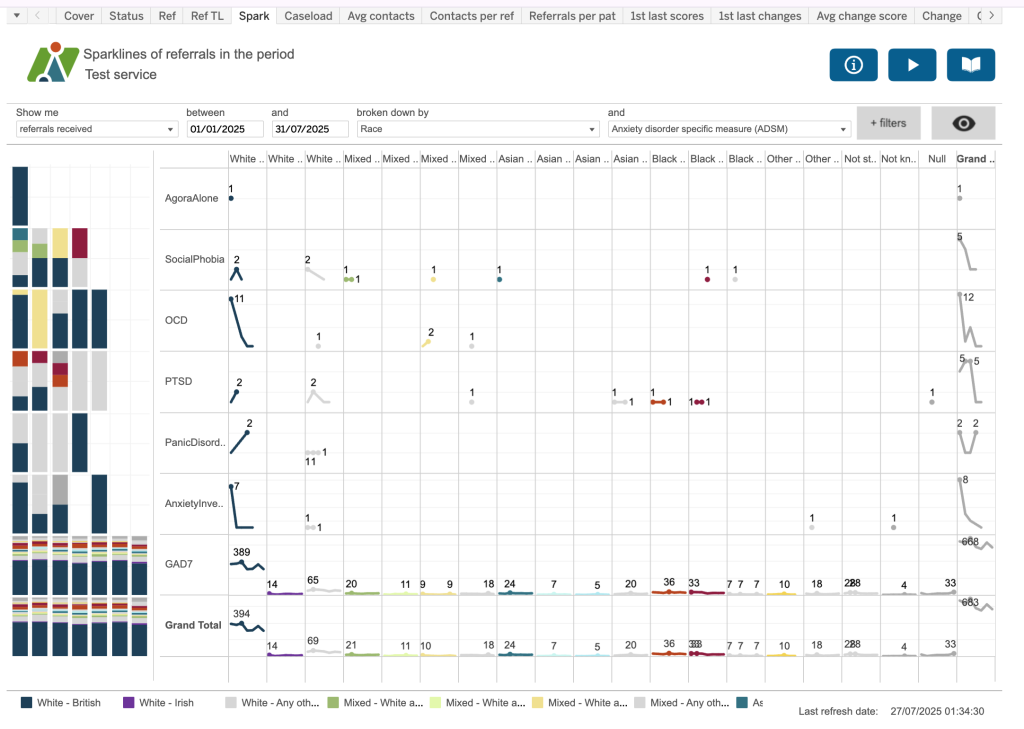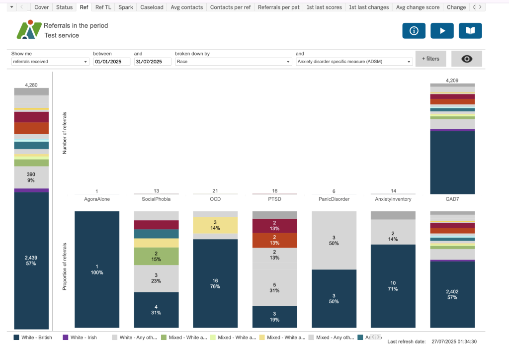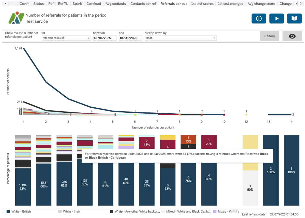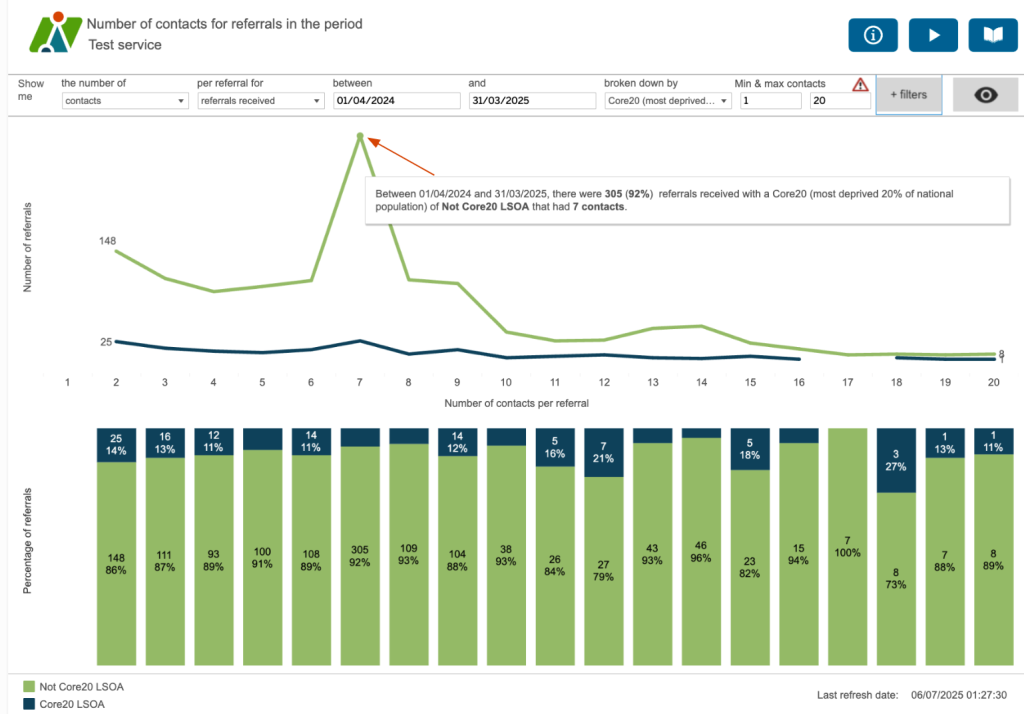 This dashboard helps to identify where there might be differences between various characteristics in the number of contacts per referral. Here we’re looking at the split between those referrals where the patients’ residence is from an LSOA which is considered one of the Core20 or not a Core20 LSOA. The Core20 LSOAs are the most deprived 20% of LSOAs nationally. For this service, the majority of referrals which are not the most deprived nationally have 7 contacts. Although there is a small spike in those that are deprived, there isn’t the same significant spike – indeed it looks as though a similar (if not slightly lower) number of referrals have 7 contacts compared to those that have two.