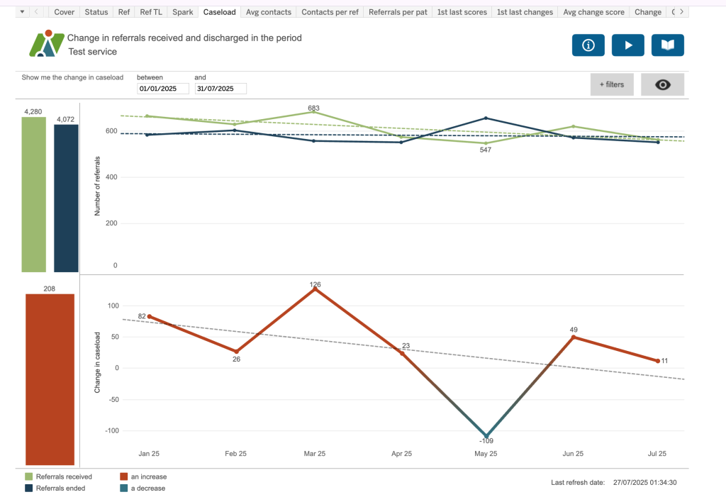 The top chart show number of referral received in the period (green line) vs number of referrals discharged in the period (blue line) along with a trend line.
