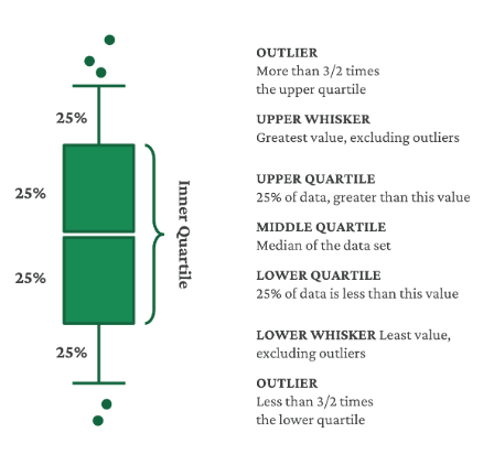 Box: The box itself represents the interquartile range (IQR), which is the range between the first quartile (25th percentile) and the third quartile (75th percentile).