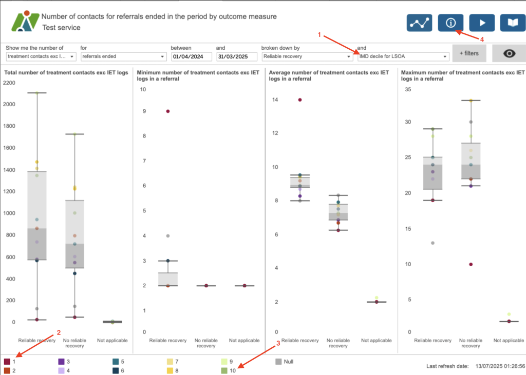 (4) The information button helps to understand the different elements of the plot but generally we can see that those referrals with the lowest treatment contacts are from the more deprived areas.