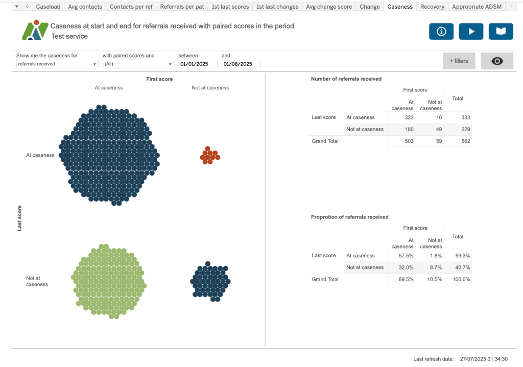 Caseness at start and end for referrals received with paired scores in the period.