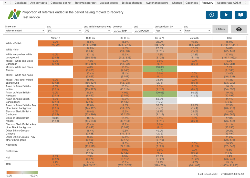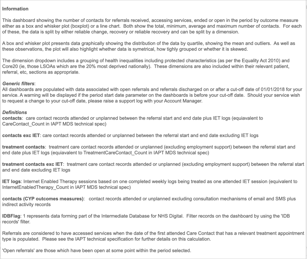 In this example, we can see the number of treatment contacts (excluding IET logs) for each referral – the total, minimum, average and maximum.