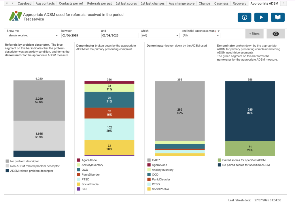 Appropriate ADSM used for referrals received in the period. This dashboard shows the number of appropriate ADSMs used for referrals received, accessing services, ended or open in the period.
