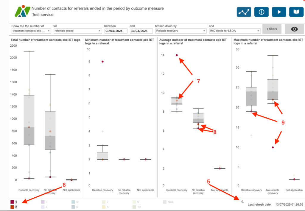 If you hover over the legend a highlight button will appear (5). This allows you to highlight any selection – (6) here we have selected the IDM decile 1 and 2. [(7) This shows you that the referrals where the patients live in the most deprived areas tend to have higher average numbers of treatment contacts in order to reliably recover compared to other deciles, and (8) when they don’t reliably recover they have a lower average number of treatment contacts. (9) The maximum number of treatment contacts for the more deprived deciles is below all of the other deciles.