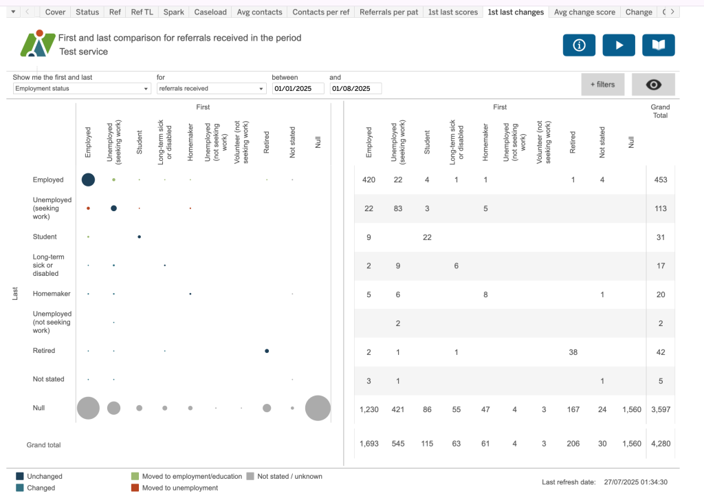 This dashboard shows the first and last status for employment, sick pay, sick absence, care cluster and psychotropic medication. The chart on the left shows first and last indicated by a coloured dot (see key) and the right chart gives you the data behind each value.