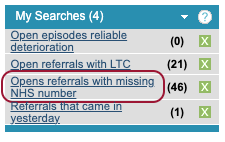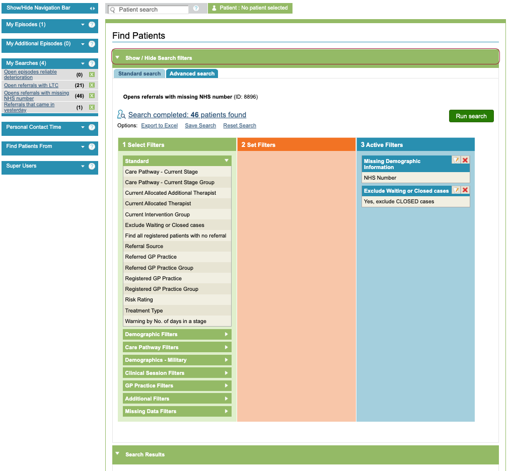 If you wish to view or amend the filters, you can expand the ‘Show / Hide Search filters’ section which will take you to the Find Patients: Advanced view.