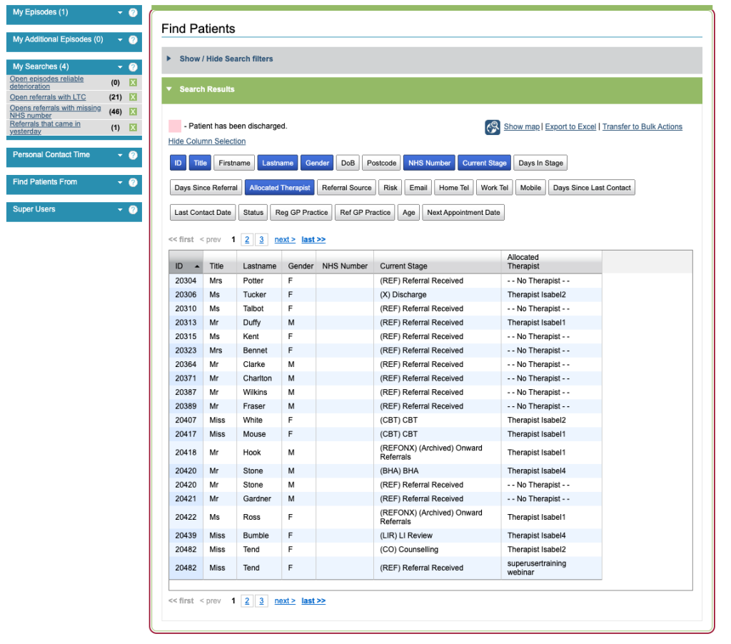 You can choose which information displays in the table by clicking on the options within Column Selection; the items in blue will be displayed and the items in grey are not selected. You can also show the map of the patients postcodes, export the results to Excel or transfer the results to Bulk Actions.
