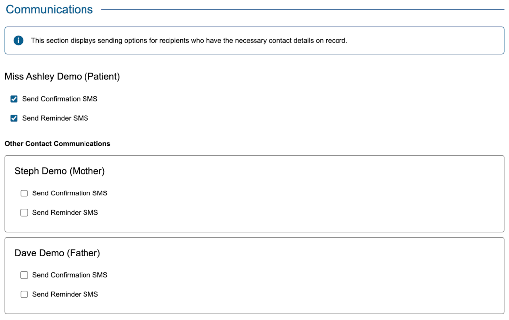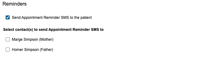 Much like confirmation messages, at the point of booking the appointment you have the option to select whether a reminder message is sent to both the patient and any applicable additional contacts.