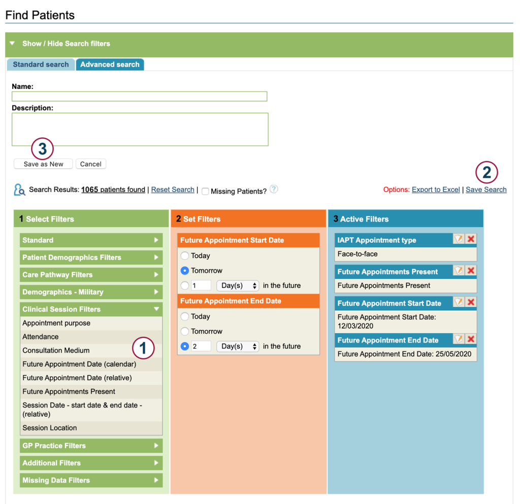 Create your search using ‘Find Patients’ advanced search and the filters within this function.