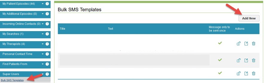 You will then need to select the Bulk SMS Template option within the Superuser menu to create your SMS template. Click the ‘Add New’ option to create your new Bulk Action.