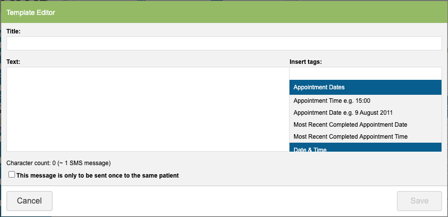 For the main text area, you can type in the contents as well as using tags which will retrieve information from the selected patients’ records and automatically populate the SMS text for you.