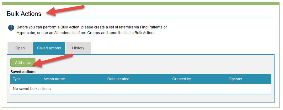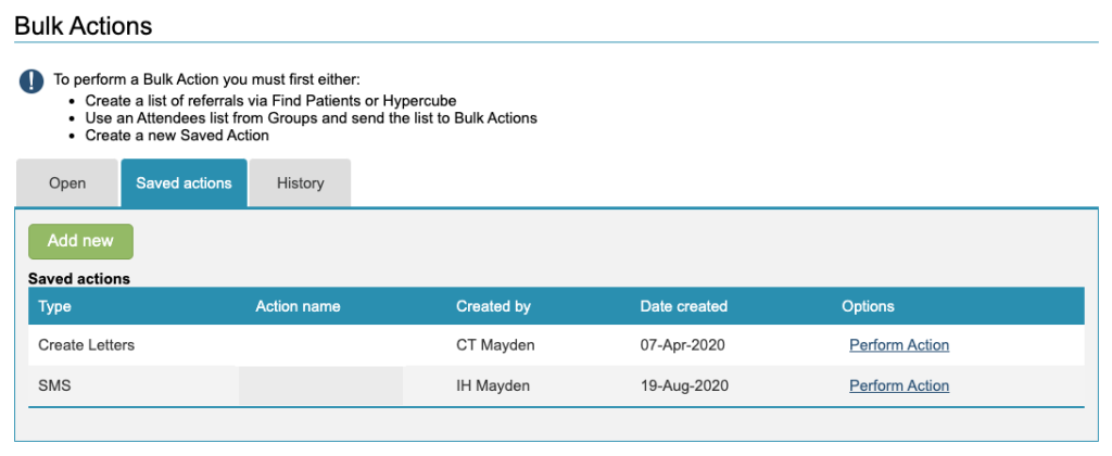 This will prompt you to select the group of patients you wish to perform the actions for (eg. the search that you created and saved earlier).