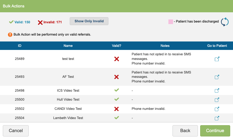 The next screen will review your list of patients and check for any reasons as to why the SMS cannot be sent. If there is a red X in the ‘Valid’ column, the reason why the SMS cannot be sent will be shown in the notes and you can ‘Go to Patient’ to rectify the issue if you wish.