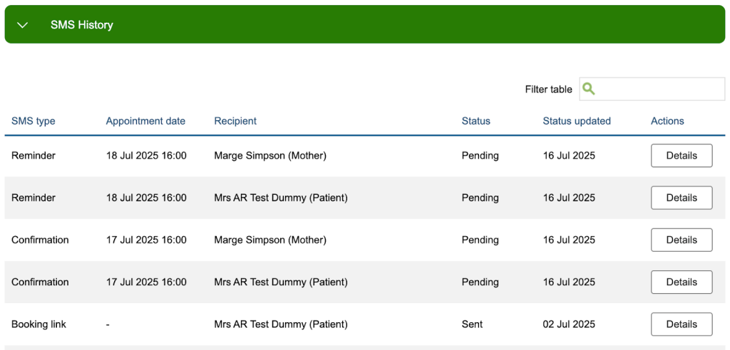 Clicking on a heading within this table will reorder the messages based on that column, or you can search in the ‘Filter table’ box for a particular recipient, status, or message type. You can also filter for a specific date by entering it in the short format yyyy-mm-dd. Clicking ‘details’ provides further information including the message content and status history.