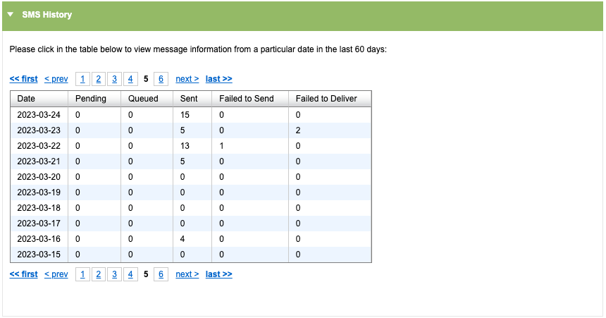 Superusers will have visibility of a history table which shows the number of SMS in each status category. Each section can be clicked on to drill down further into the detail.