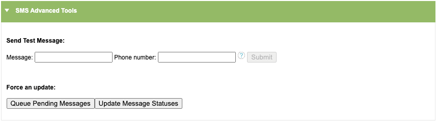 Under the SMS Advanced tools section, a superuser can test the system by sending a SMS to themselves.
