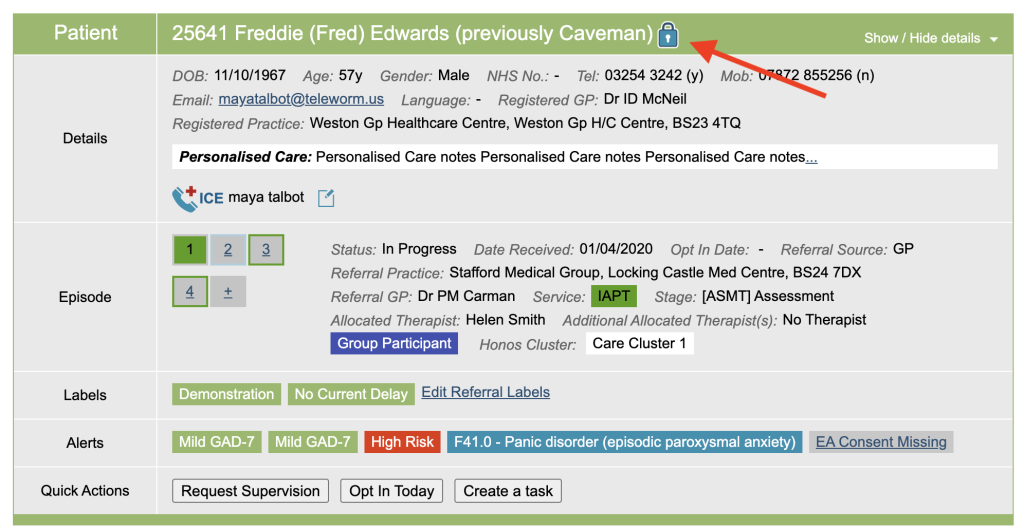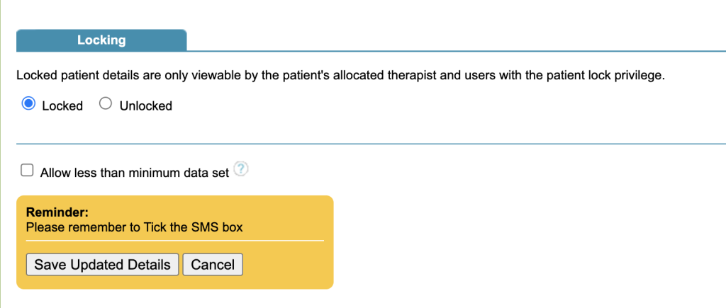 Only users given patient lock permission can see the details for locked patients, or find them in a search. The allocated therapist will also be able to look at the patient’s record while they are allocated to the patient.