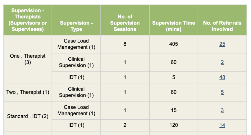 The Supervision report lists Supervision sessions that can be grouped by the Supervisor/Supervisee, Location and Type.