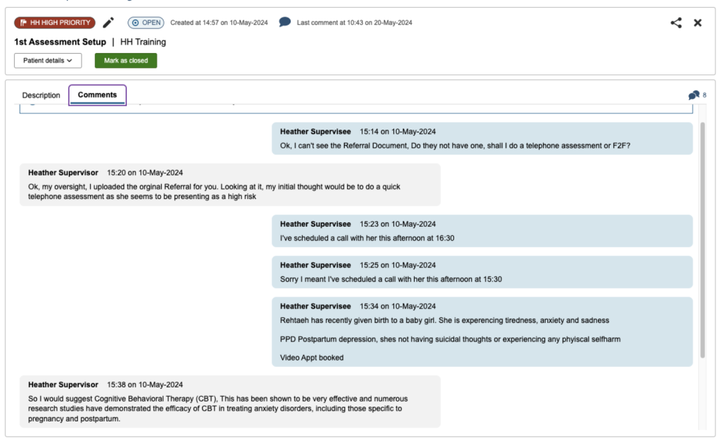 Notifications are sent when a task is created, closed or any comments added. These are received by the associated therapists and (if different) the user that created the task.