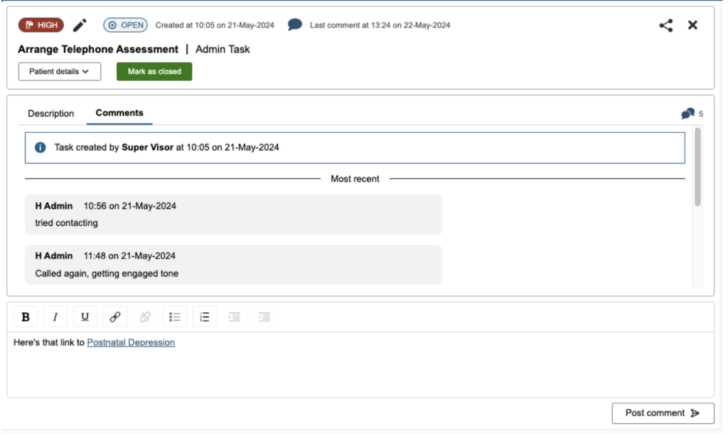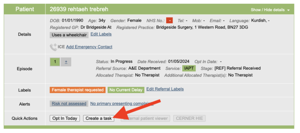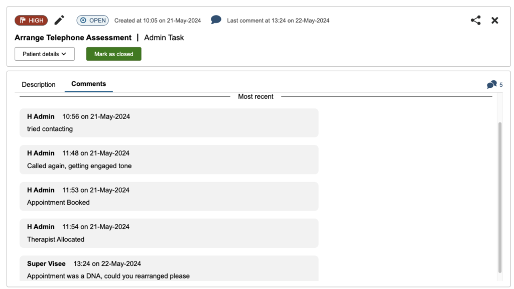 Tasks allow you to add an action against a patient record for a therapist or an admin user to carry out.