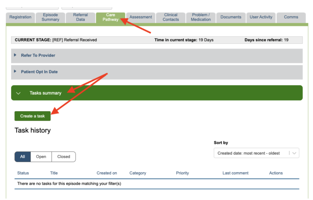 Or you can Select Create a task option under the Tasks summary section under the Care pathway tab