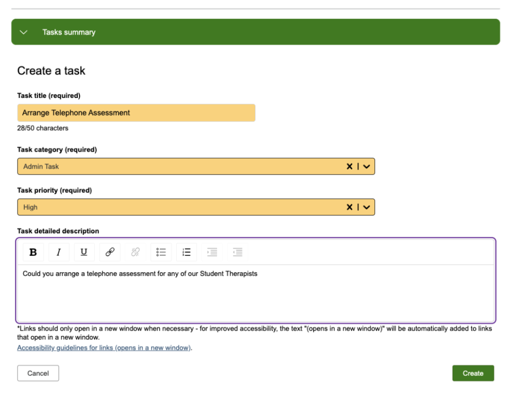 You will be presented with the Create a task window. Enter the Task title and select a Category, once a category is select the priority options will appear, shown below.