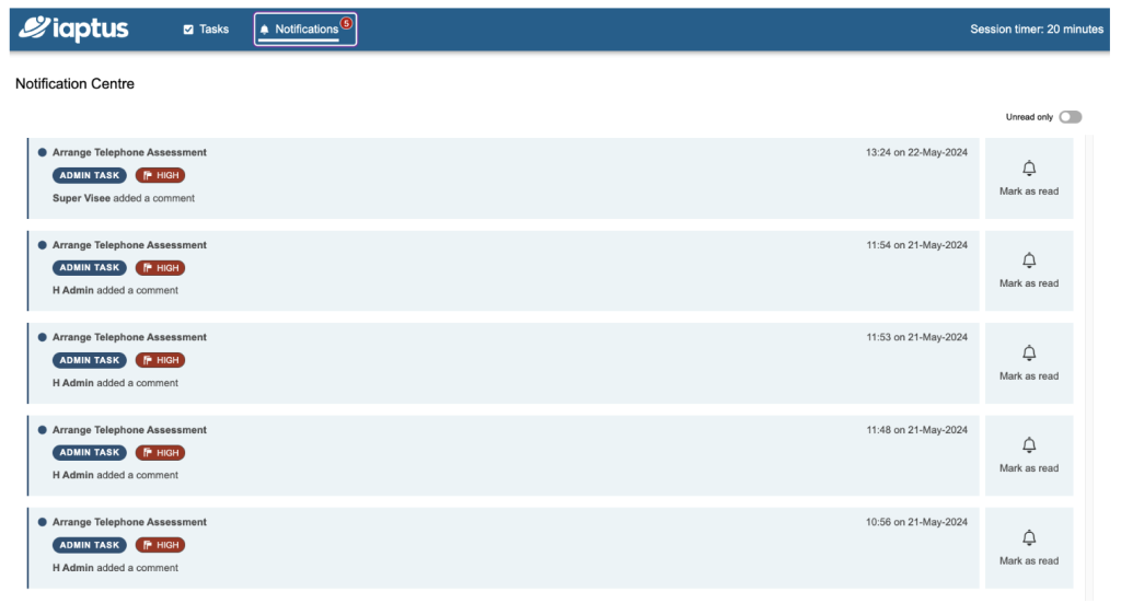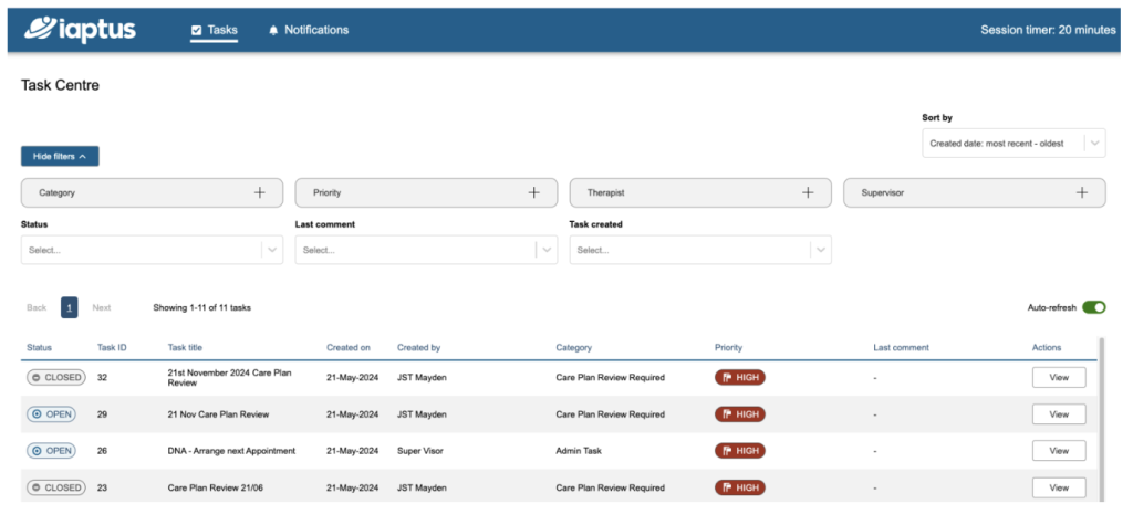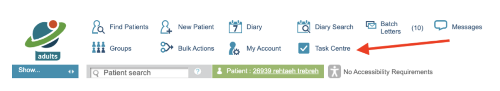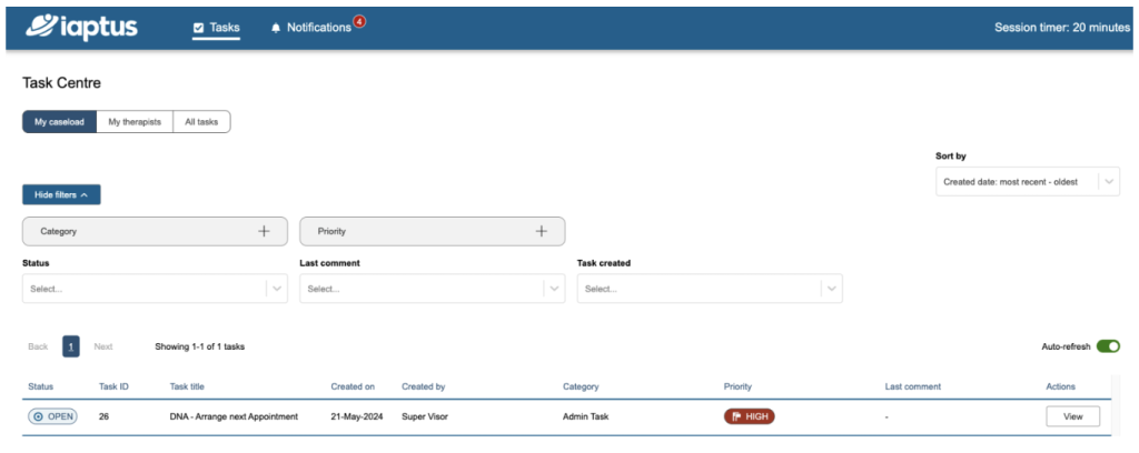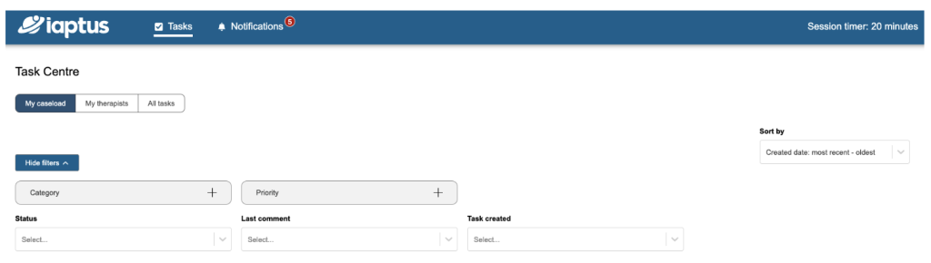 The Task Centre allows you to centrally view all tasks for your service and can be accessed from the Task Centre icon at the top of iaptus.