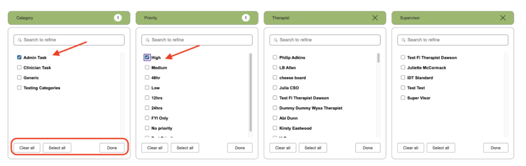 They will be presented with different filters depend on which button is selected My Caseload, My therapists or All tasks.