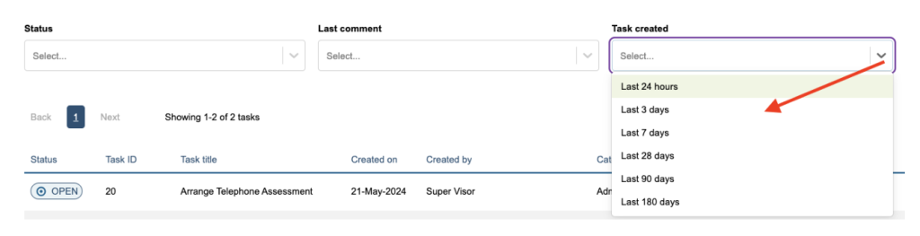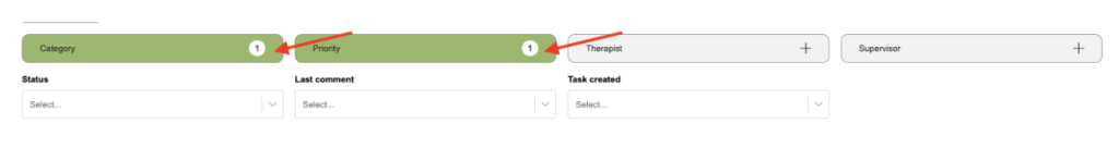 Admin users have the options to filter the list by Category, Priority, Therapist and Supervisor on the top row and on the bottom row you can filter by Status, Last comment and Task created.
