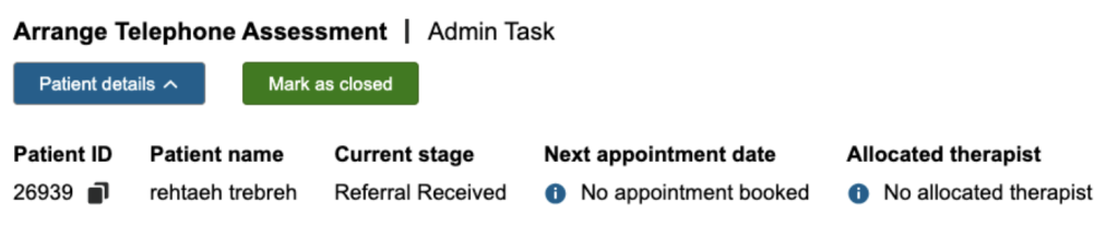 - The Patient details button, which will expand/close the patient details, showing Patient Id (which can be copied, Patient name, Current stage, Next appointment date and Allocated therapist.