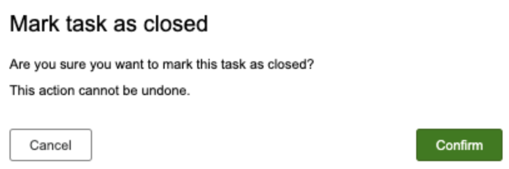 You will be presented with a confirmation message. Please be aware that when you close a task, this action cannot be undone.