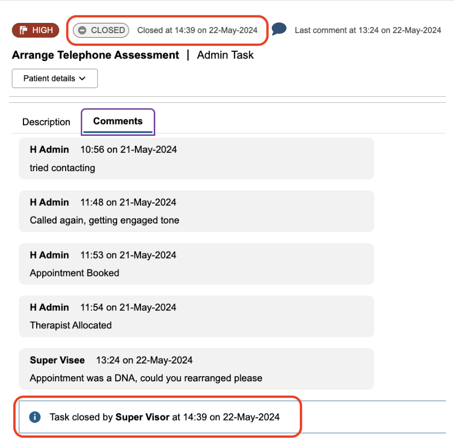 The status of the task will be marked as closed along with the closed time and date at the top. The last comment will also display user, time and date closed.