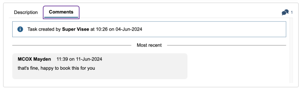 If there is a new notification, new comment or task closing alert, There will be a red blob next to the Comments heading, which will clear once the comment has been opened.